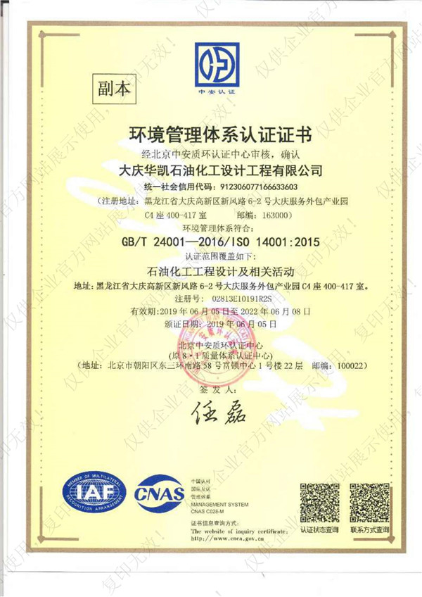 環境管理體系認證證書